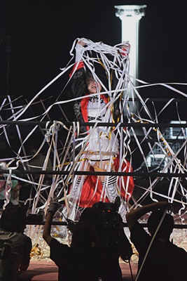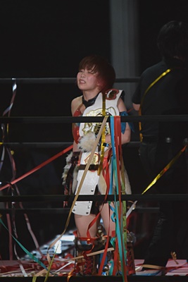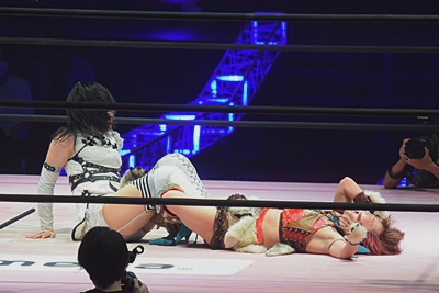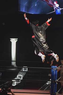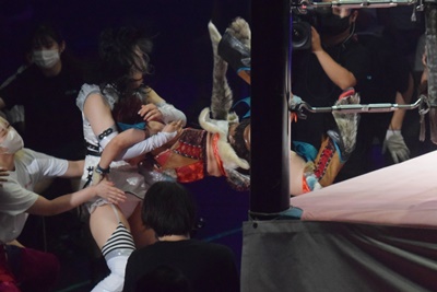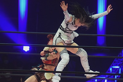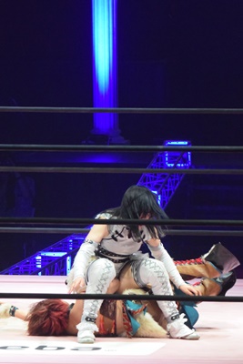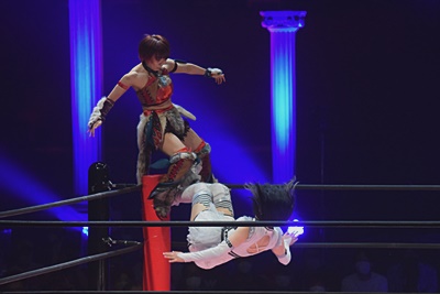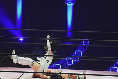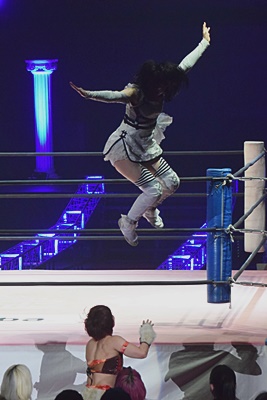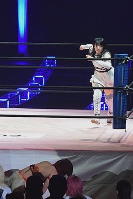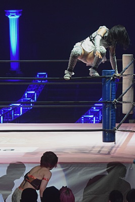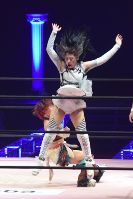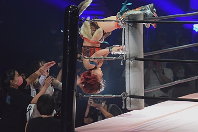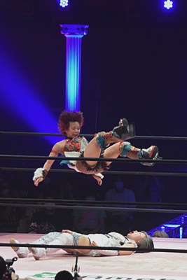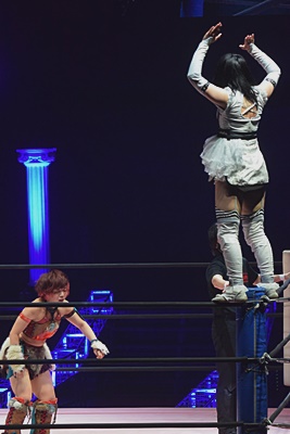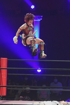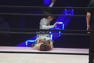 さらに鉄柱で中島の足を攻撃。リカ中島をリングに戻す、すると中島は助走つけてトペ・スイシーダ(右写真)。