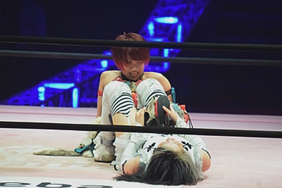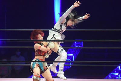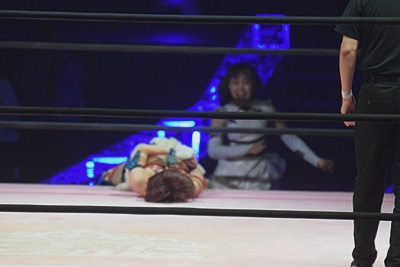 中島がコーナーに上るとリカは足目掛けてドロップキック(左写真)、リングに落とす。