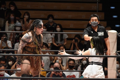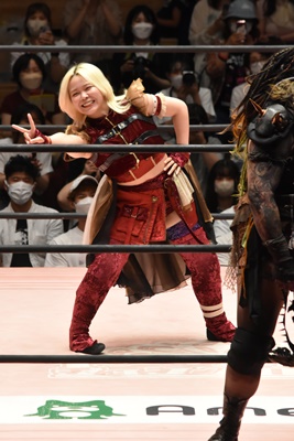 辰巳リカ入場、マックスを挑発?(右写真)