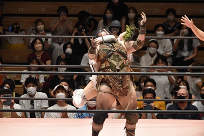中島エルボー連打、コーナーに上ってライダーキック(左写真)。15分経過。