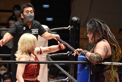 タッグパートナーに睨みつけられるユキ(左写真)。