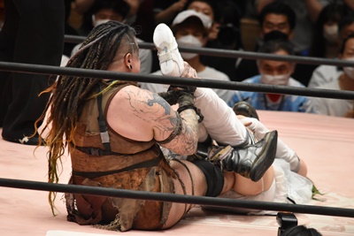 孤立したユキだったが中島をショルダーブロックで倒し(左写真)