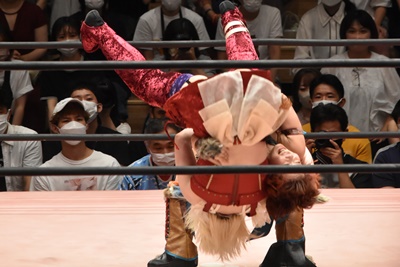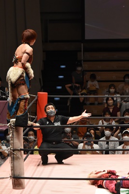 場外に出たマックスに中島はトペ・コン・ヒーロ(右写真)。マックスコーナーに上る。ユキがリングインするが意思の疎通が取れていない。5分経過。