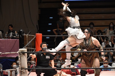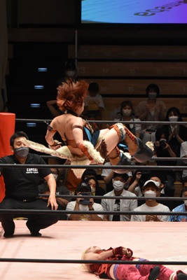 リカジャンピングヒップアタック(右写真)。ユキはマックスにタッチ。