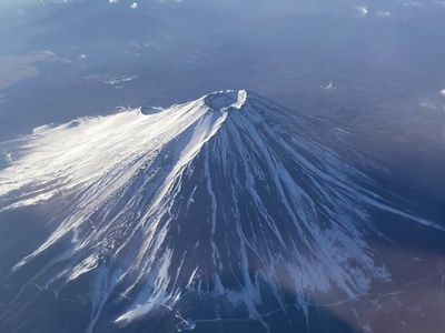 食べてるとすぐに「左手に富士山」のアナウンス。この時の高度は約8000メートル。富士山さんの頂上は約4000メートル下。