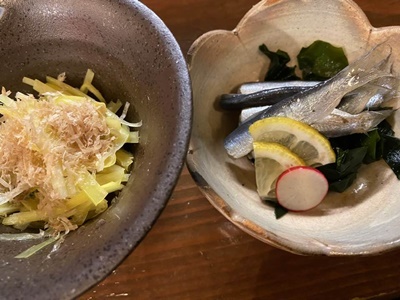 ままかりの酢漬けとか黄ニラのおひたしとか岡山っぽいものばっかり頼んだ。