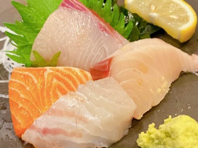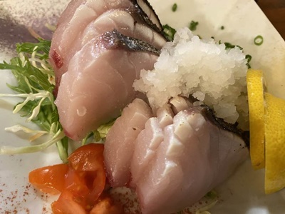 刺身盛り。鯛とヒラマサとブリとサーモンかな?特に瀬戸内のものではない。でもうまい。