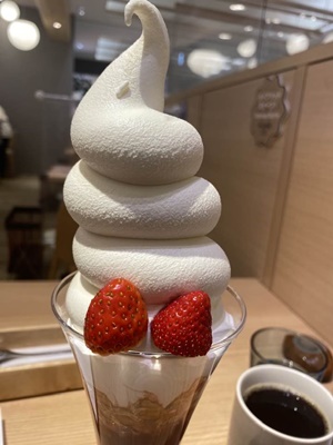 岡山駅に。19時半。サンライズ発車まであと3時間。一回酔いを醒ますことにして喫茶店探すが星乃珈琲店は店員が出てこない。さんすての1階歩いてたらパフェが売りのカフェ「からふね屋」があったので入る。ほぼソフトクリームにしか見えないが、パフェグラスの底にはいちごソースがたっぷり入ってて、混ぜることでパフェになる仕組み。これはうまい。調べたら京都の店で、ほかに大阪と岡山にしかないらしい。