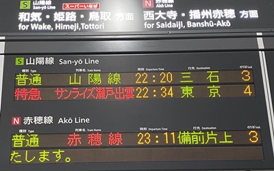 時間つぶしにさんすて1Fのスーパー「ユアーズ」(広島が本店らしい)に行って見る。セブンイレブンより安いので酒はこちらで買う。一瞬シャインマスカットに心惹かれるが産地見たら長野だったり広島だったりなのでやめた。そういえば土産物屋には売ってなかったな。その辺が名産地の誇りか。改札横のセブンイレブンには保冷剤が売ってあったのでビールもう一本とつまみ買う。22時にようやく改札。