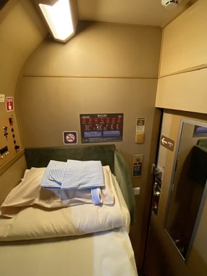 乗車。ドア入って階段上るとこのベッドにこの窓。上段でよかった。