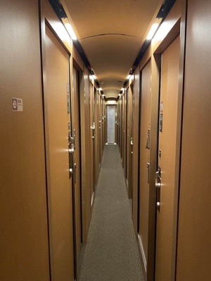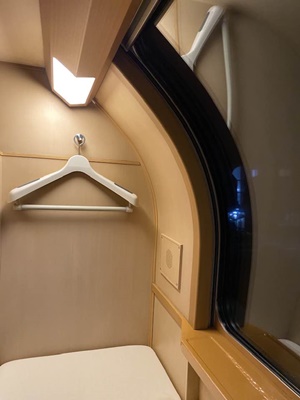 足側。荷物が置ける棚もあった。上着はそこに(ハンガーは低くて使えない)。リュックは階段に置けるし充分充分。