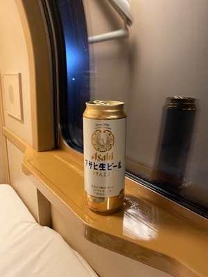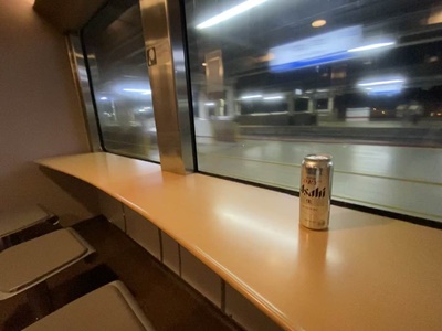 22時34分発車。つまみはあたりめ。ふじわらのみいが「あたりめにしろ」と言ったので。