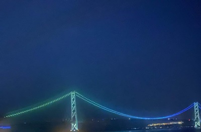 舞子駅で明石海峡大橋をくぐると教えてくれた人がいたのでアプリ駆使してタイミングを計る。すると明かりに照らされた橋が見えた。