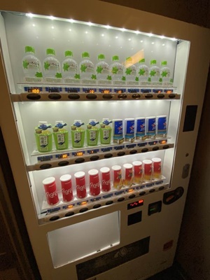 ラウンジの隣に自動販売機あるが当然ソフトドリンクのみ、車内販売はなし。