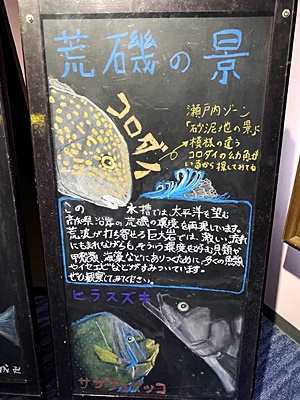 写真と水槽を組み合わせた展示が多い。それ以外は特にそう目新しいものでもないかな。このイラストの案内はいい感じ。