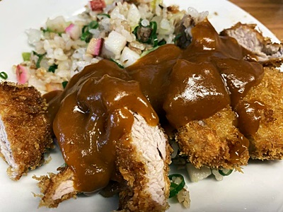 先にかつチャーハン来る。チャーハンが美味い。これは単体でもよかったかな。