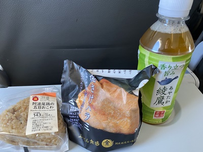 水平飛行に移ったので朝食。ローソンのおにぎり。