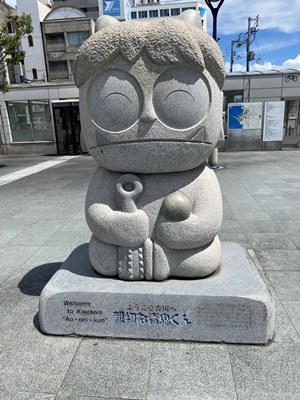 12時半、ふじわらのみいが四国一周動画でいってた「めりけんや」に行ってみるが、平日昼なので地元学生や社会人並んでて無理。高松駅に。駅前にポツンと青鬼。1989年に青鬼は香川県の「観光客を温かく迎える親切運動」のマスコットキャラクター「親切な青鬼くん」として採用されたのだそうだ。青鬼は演技ながら村人を襲う方だよなあ。