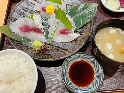 小田原城に行く途中にも何軒か海鮮丼やアジフライを出す店はあったがどこも2000円。駅にあった「魚國」に入る。アジフライ定食が1600円だったが売り切れだったのでダツの刺身定食を注文。結局1980円。でも美味い。