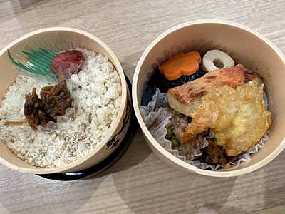中。鯛めしwithあさり、キンメダイは塩焼き、そして海老のてんぷらと野菜の煮物、そぼろ。美味い。