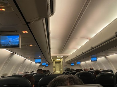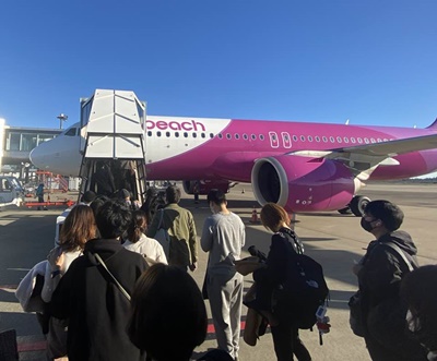 バスで移動し20分にPeach312便に搭乗。今回通路側なので窓からの風景は撮れない。ちなみに「機内にて写真や動画の撮影することによるトラブルが増えています。他の乗客やキャビンアテンダントを無許可で撮る行為はおやめください」という注意があった。30分離陸予定が42分にようやくドアが閉まって出発。あの混みようじゃそうなるよな。離陸は30分遅れの9時。