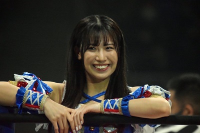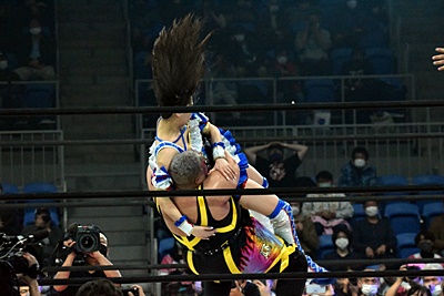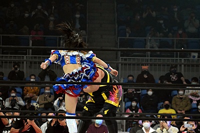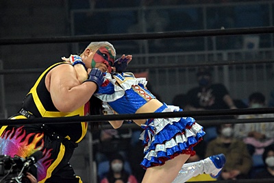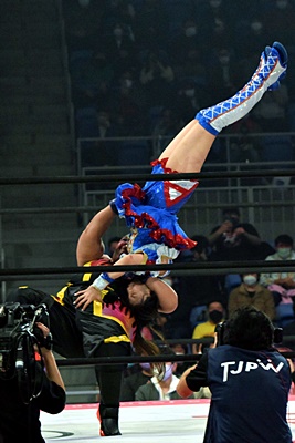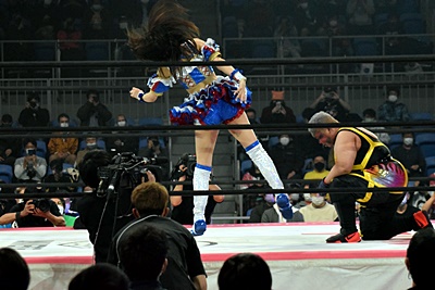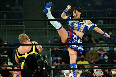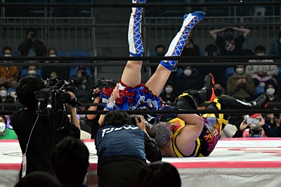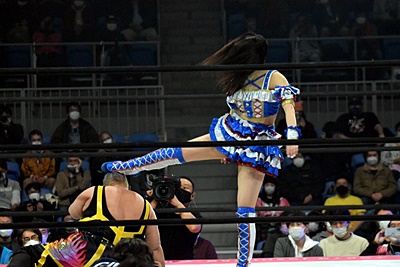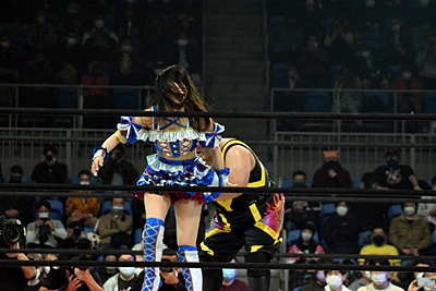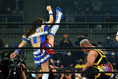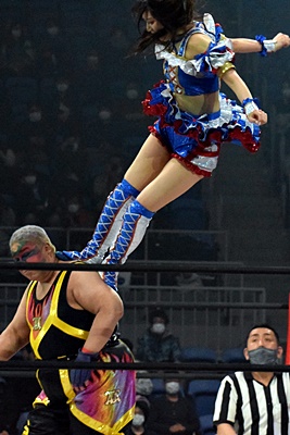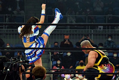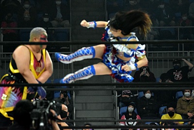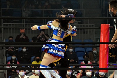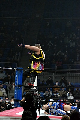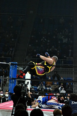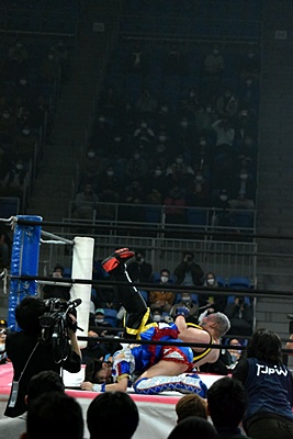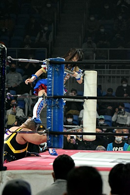 コーナーに上ってミサイルキック(右写真)、カウント2。