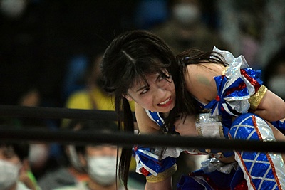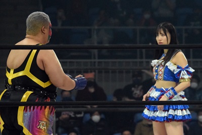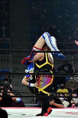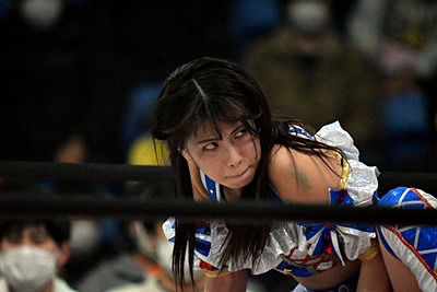 押し合い(右写真)、アジャがロープに詰めてブレーク。