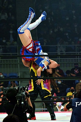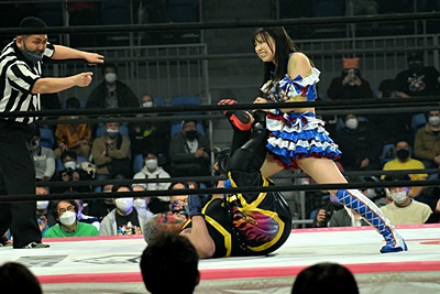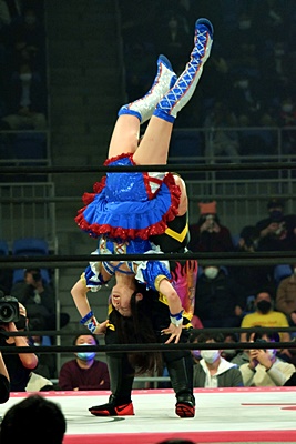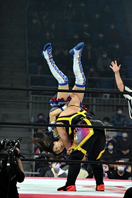 荒井サソリ固め狙うが(左写真)アジャは下から蹴ってブロック。