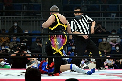 ロープに飛んでもう一発ビッグブーツ(左写真)、カウント2。