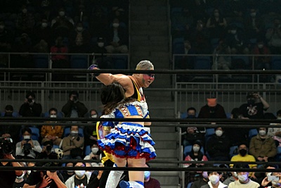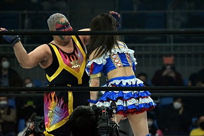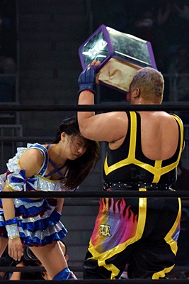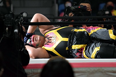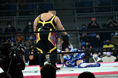 場外に逃げたアジャを追いかける。アジャ張り手で形勢逆転、アジャがエプロンに新井を戻すとまだ場外にいるアジャ(右写真)、