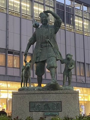 桃太郎像の前の石に座って休憩。1万4000歩も歩いたので歩き系アプリの処理に時間がかかる。