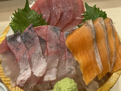 「八閣」が満席だったので岡山料理食うのはあきらめて「築地食堂 源ちゃん」に入る。刺し盛。当然だが岡山の地の物はない。