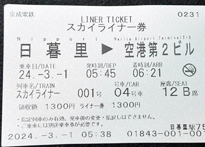 今回は時間に余裕を持たせるためスカイライナー利用。券売機でスカイライナー1号の指定券を買う。1300円。