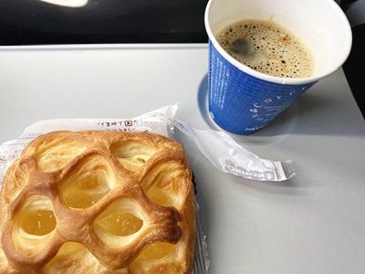クルーが「500円までのお買い物チケットついてます」と。何回か乗ったからかな?せっかくなのでアップルパイとコーヒー注文。