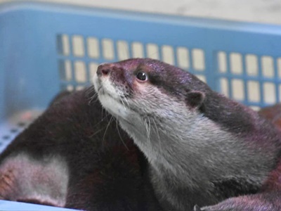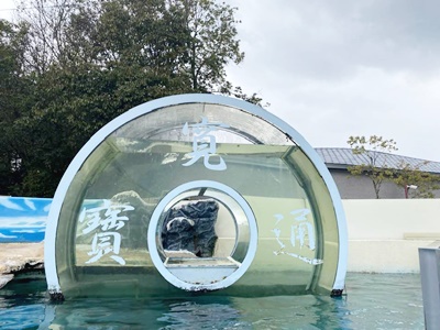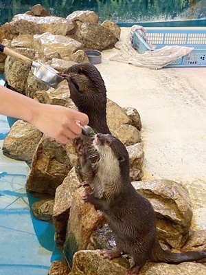300円でエサやりができるというので自販機で1000円崩して待ってたら200円という話。エサやりはヒシャクに入れたエサをソラに差し出すだけだった。右側の手はキーパーさん。