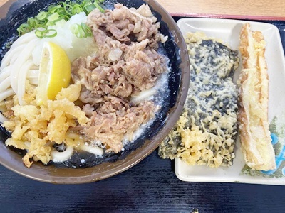 肉ぶっかけうどん(ひや)とのり天、ちくわ天。ここも来る予定だったからね。
