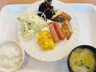 8時から無料朝食食べに2階に。これだけあればありがたい。しょうもなかったら駅近のロッテリアにしようかとも思ってたんだが。
