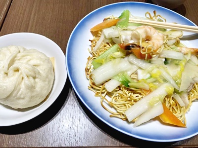 海鮮焼きそばと豚まんとビール。これ昼飯だよなあ。朝食から9時間開いてるけど。昨日よりさらに朝食と昼食の間が空いた。まあ会場でもバスでも食事できないのでしかたない。パンは明日の朝食だ。