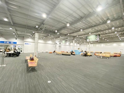待合室は殺風景。「揺れが予想され機内の化粧室が使えないかも」と言われたのでトイレに入っておく。