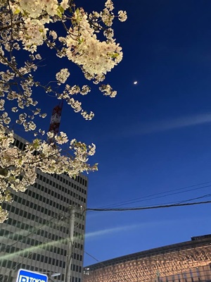 会場はがいせん桜通りの真ん中辺り。両側に由緒ありそうな建物と桜並木。こうもうまい具合に桜の満開時期に開催できたとは。天気もいいし。むしろ良すぎ。