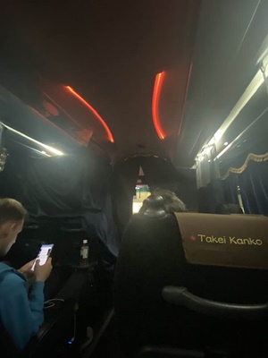 「貸切」表示の連絡バス(無料)は22時30分ちょうどにバス停に。結構満席(2人席に1人座ってる人が多かったが)。