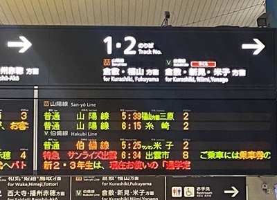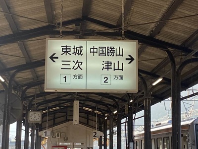 改札横のセブンイレブンはやはり開いてない。パン買っておいて正解。券売機で中国勝山行きの切符を買い(新見経由は津山経由より100円高い1980円)、改札内に入って2番線で列車を待つ。