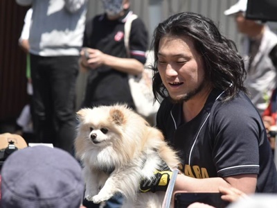 11時、岡山駅からの送迎バスがちょっと遅れてるということで龍ちゃんがゆっくり目に前説、そしてBASARAの試合開始。中津が最前列にいたポメを再三使う。おとなしい犬だなあ。