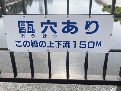 部屋から東京ばなな取って駅に戻る。昭和橋に「甌穴あり」の看板。