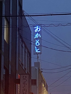 適当に時間つぶして19時20分に「おかもと」に。表通りからは見えないが、こんな派手な看板が。