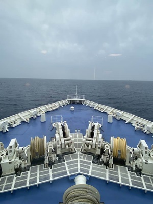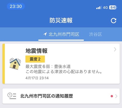 23時14分、皆の携帯から地震警報。豊後水道が震源で愛媛県南部と高知県西部で震度6弱と。船は問題なく出るようだが…