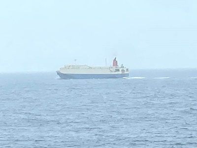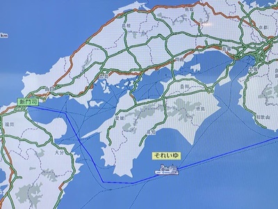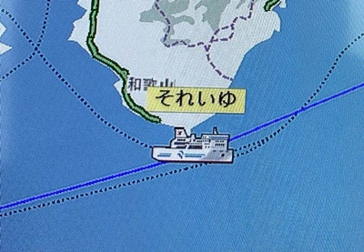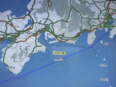 船長挨拶あり。波は1〜2mだそうだ。潮岬は11時頃、18時頃に伊豆半島通過、と。「はまゆうとすれ違う」というアナウンスがあったが、ぼーっとしてて見逃す。なんか船が行くのは見えたが、これはRO-RO船の「みやこ丸(もしくはむさし丸)」のようだ。