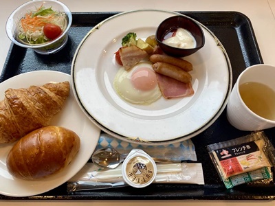 6時20分に自然に起きる。シャワー浴びて7時から朝食。結果的に朝食べれるようなとこが駅周辺になかったので朝食つけといてよかった。値段(当日付けたら900円)相応のちゃんとした朝食だし。