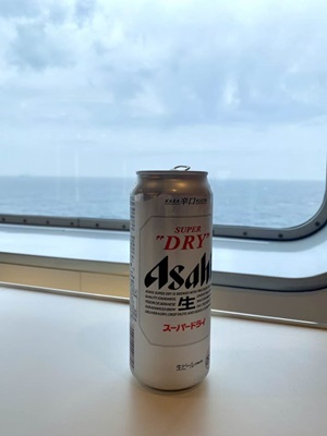 ショップでビール500ml2本と柿ピー買い(支払は資さんうどんと同じタイプの自動精算機)、5階の窓際でビール飲みながら出航の様子を見る。23時47分タラップ収納らしき音。54分横動き始まる。55分前進開始。予定通り出航。部屋に戻る。ふじわらのみいがメンバー向けにライブで話した内容のメンバー限定動画上げてたのでそれも見る。