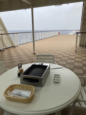 ちょっと寝る。ベッドに転がってる方が揺れ感じる。10時50分に起きれたので窓際に行くが、潮岬は見えたような勘違いのような。